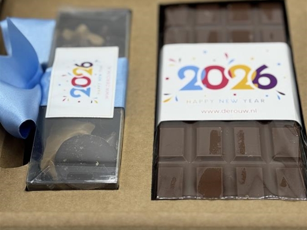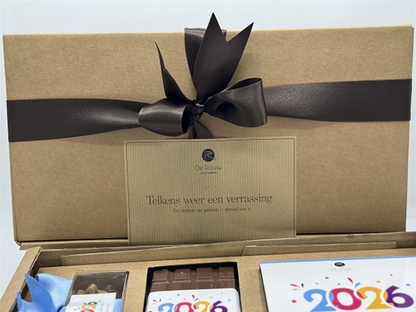 Inhoud: Luxe bonbons, een rijk gevuld doosje chocolaatjes en een verfijnde chocoladereep.